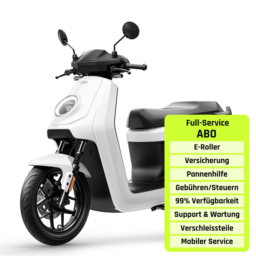 Mit dem NIU im Abo kriegst du nicht nur den Elektroroller bereitgestellt, sondern ein komplettes Service-Paket. Im Preis inklusive sind Roller-Nutzung, Gebühren/Steuern deines Verkehrsamts, Vollkasko-Versicherung, 7x24-Pannenhilfe sowie Support und Wartung (inkl. Reifen) bis an deine Haus- oder Bürotür. Das Abo ist in zwei Laufzeiten verfügbar: 12 und 24 Monate. Und wenn du möchtest, kannst du den Roller am Abo-Ende (oder auch während der Abo-Laufzeit) in dein Eigentum übernehmen.