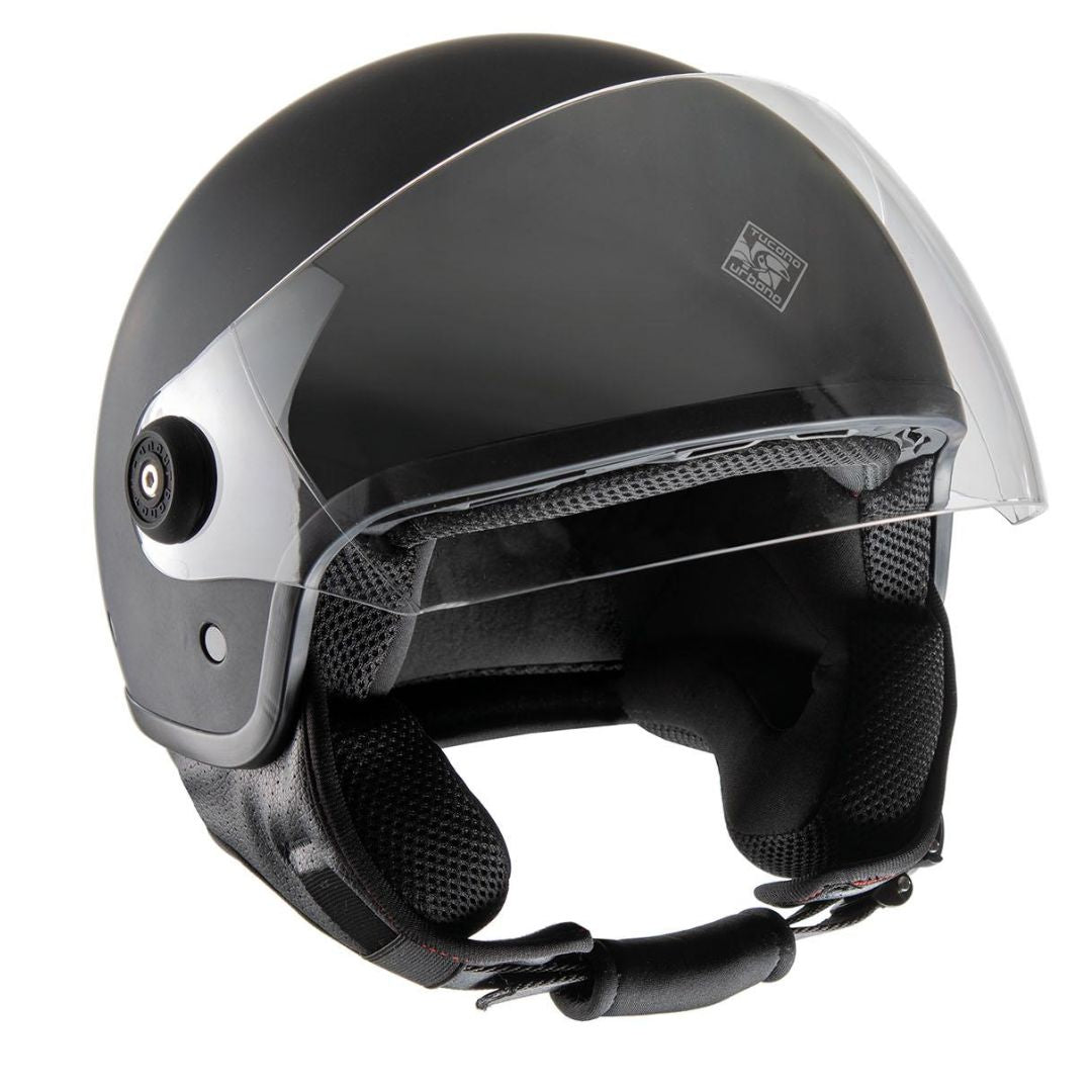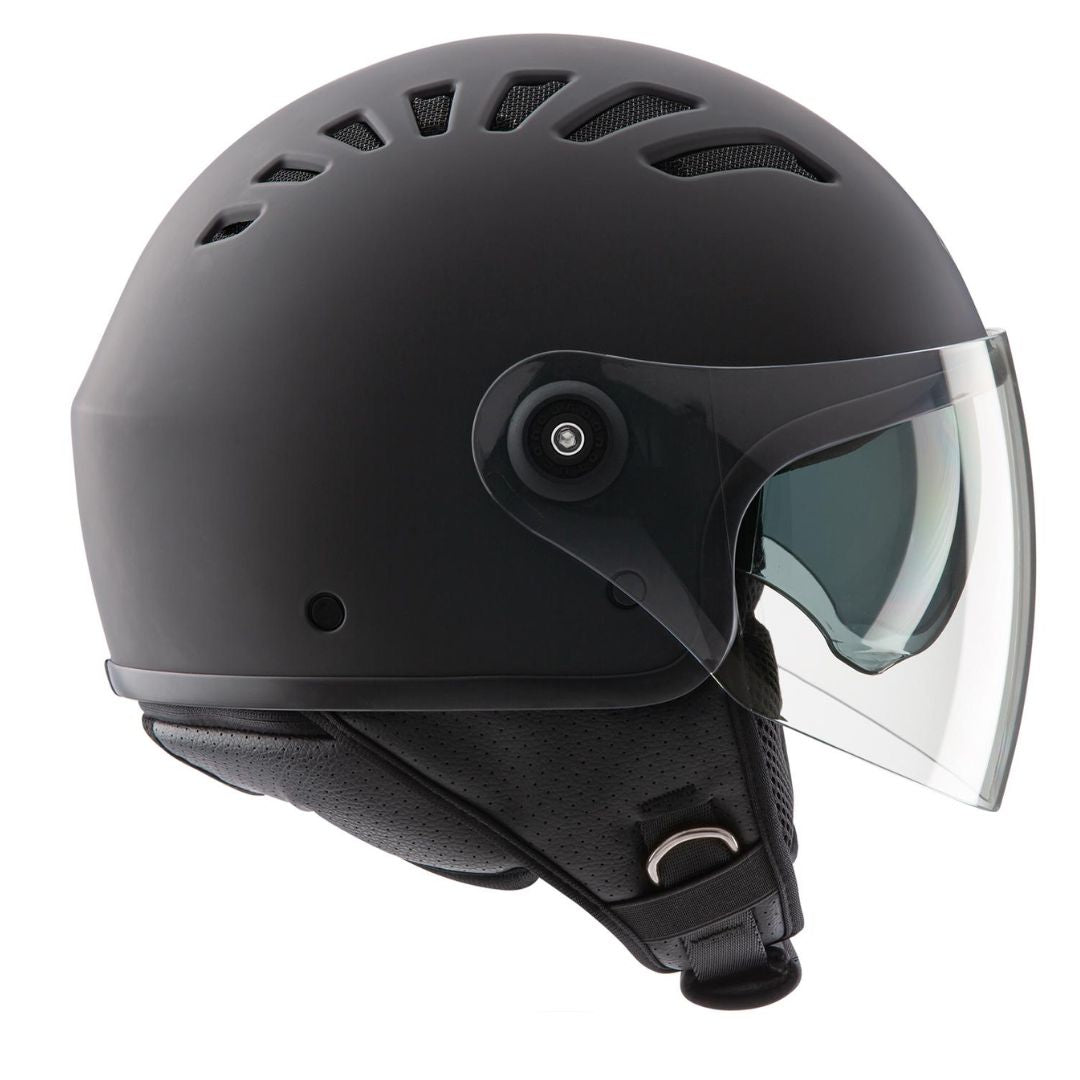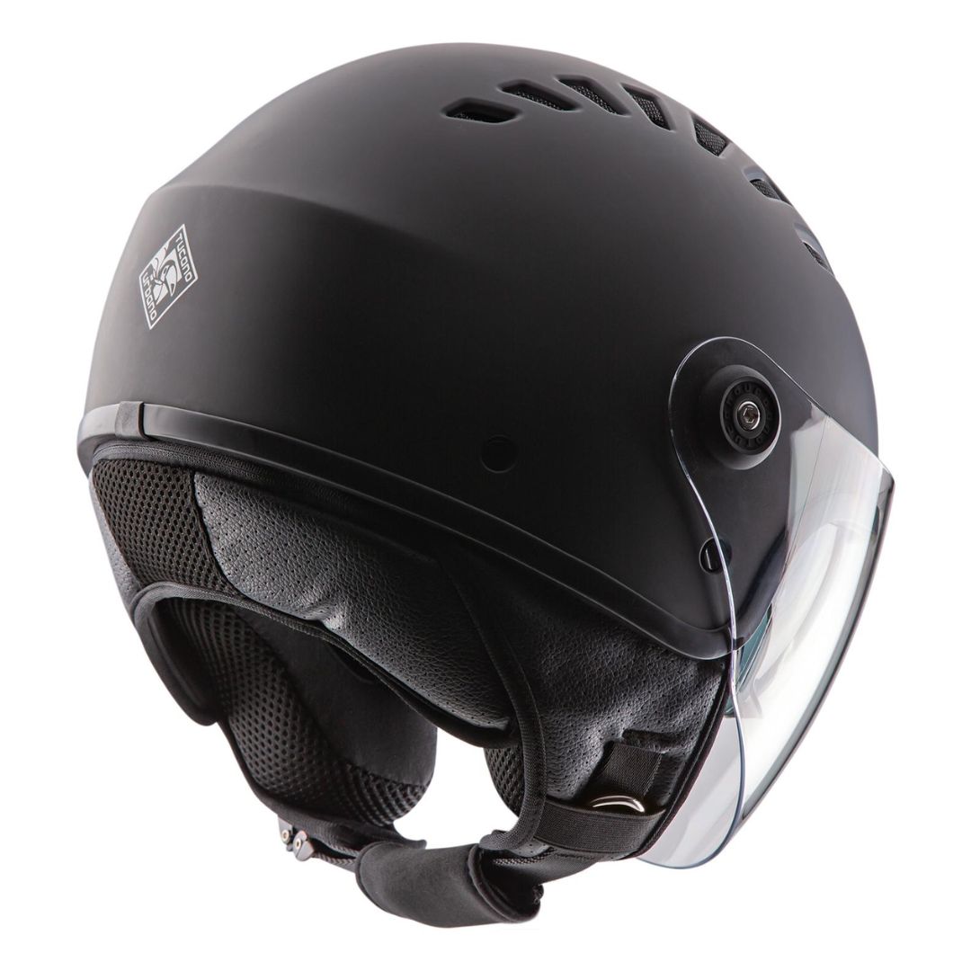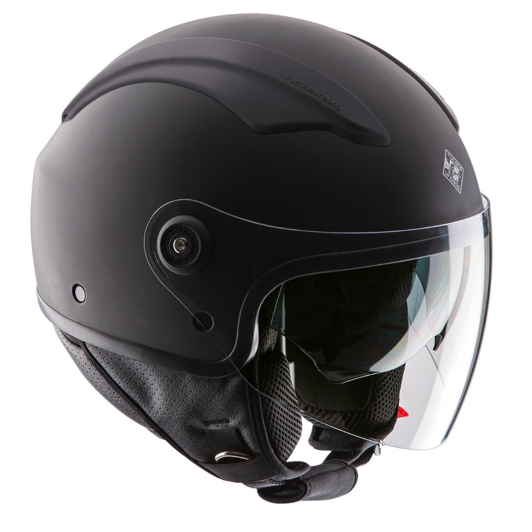 Schöner, kompakter, funktioneller, leichter Demi-Jethelm zum fairen Preis. Mit Lüftungssystem (abnehmbaren Lüftungsabdeckungen), Dual-Visier, Ratschverschluss, herausnehmbarer und waschbarer Polsterung.